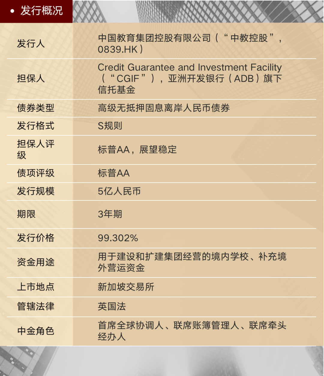 4月12日, Credit Guarantee and Investment Facility (以下简称“CGIF”,主体评级:标普AA,展望稳定)担保中国教育集团控股有限公司(以下简称“中教控股”或“公司”)成功发行3年期5亿人民币高级无抵押固息点心债。债项评级为标普AA,票面利率4.0%。中金公司担任本次发行的首席全球协调人和独家执行负责人。