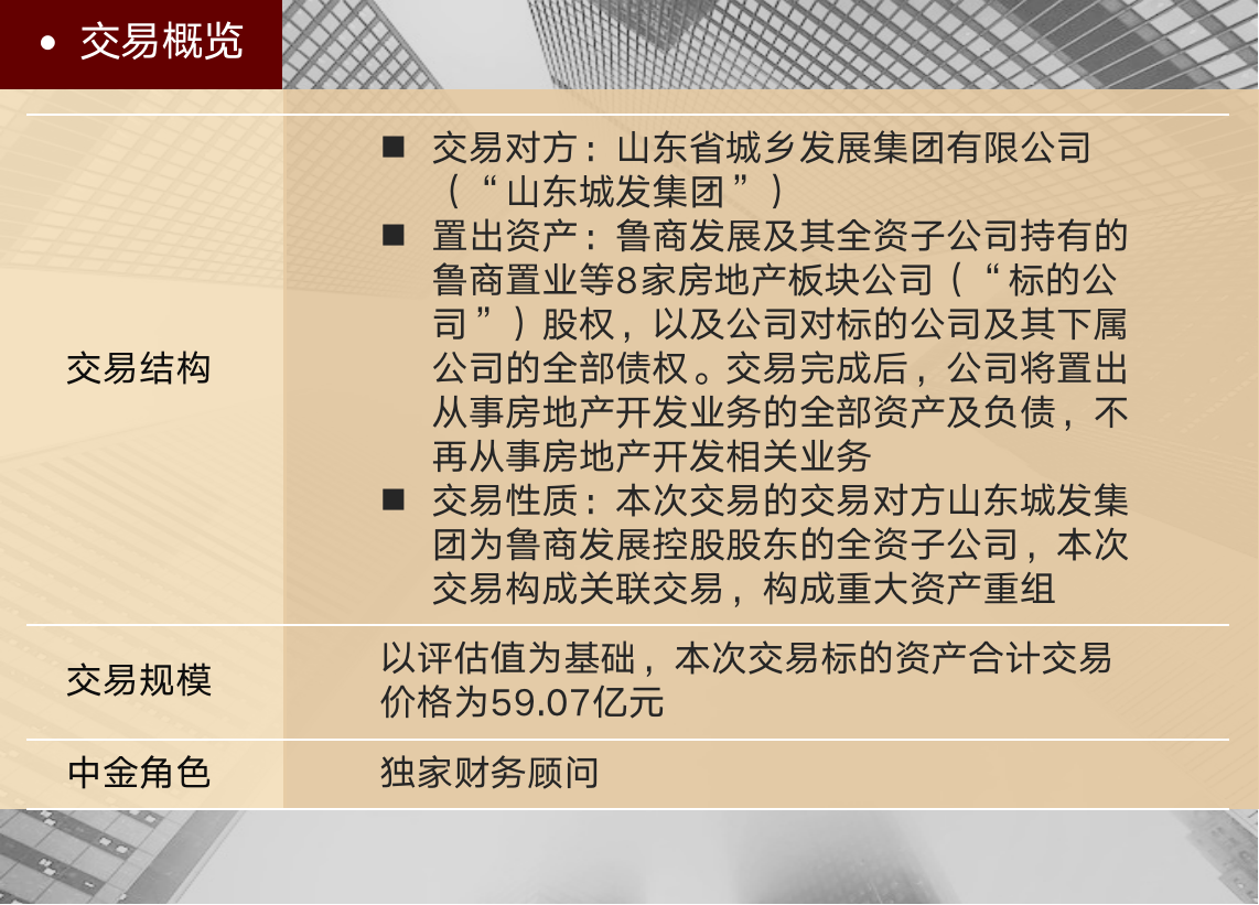 通过本次交易,鲁商发展得以剥离房地产业务,未来将聚焦于大健康业务,专注提升领域内核心竞争力和市场影响力,继续在医药健康领域探索布局,不断提高盈利能力和综合实力。本次交易是近三年省属国企A股上市公司最大规模的资产出售交易,也是中金公司助力国企聚焦主业、高质量发展的又一经典案例。