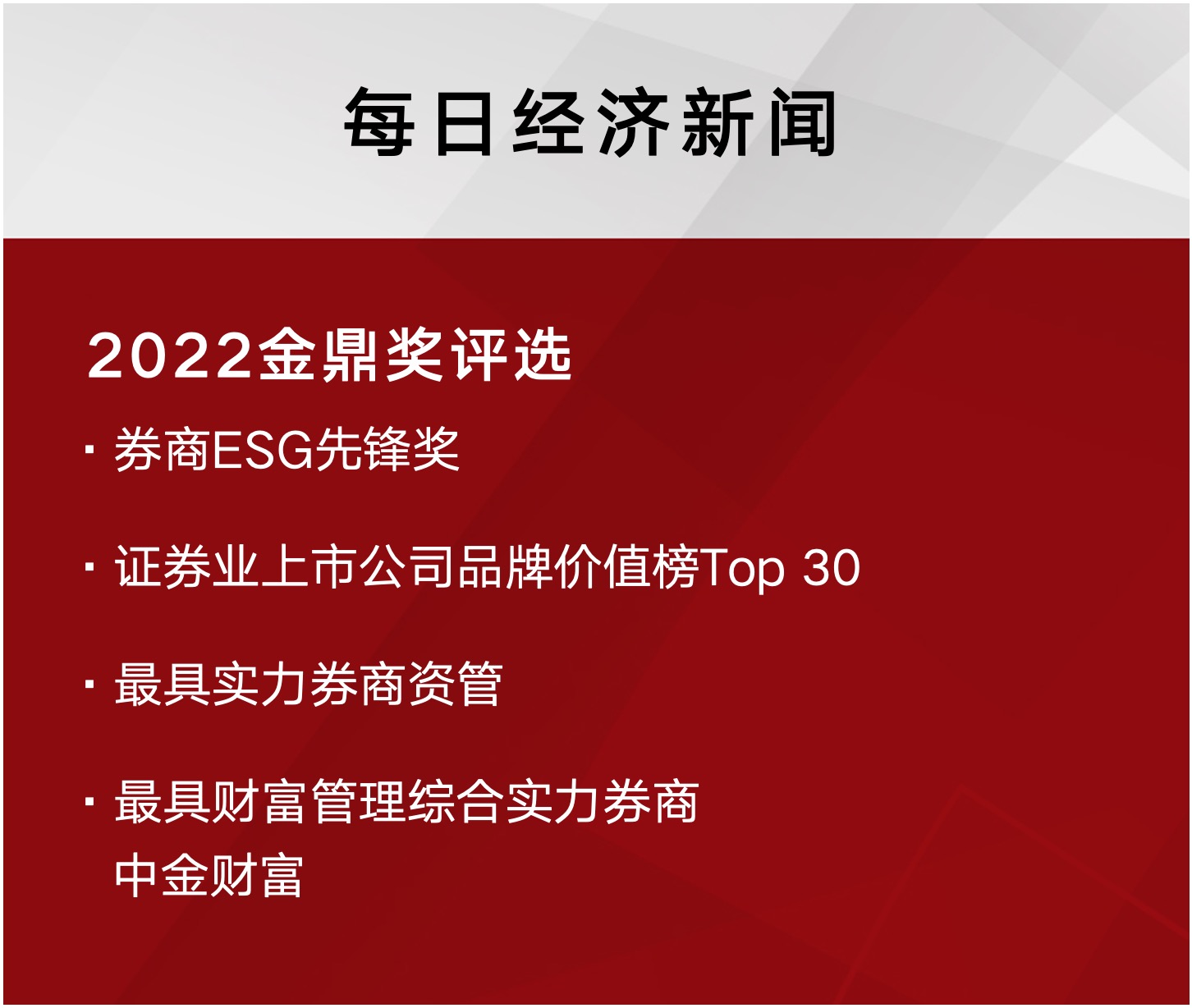 “中国金鼎奖”评选系《每日经济新闻》年度大型证券行业业务评选,评选致力于为中国投资者提供一份公正、权威的金融产品、品牌和团队机构的榜单,得到了行业内广大金融机构的关注和认可。