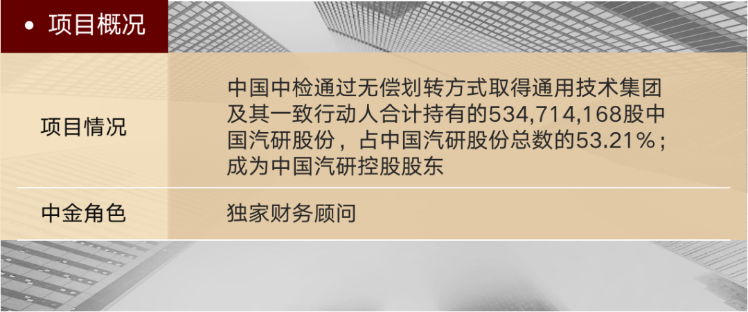 中国检验认证(集团)有限公司(“中国中检”)与通用技术(集团)控股有限责任公司(“通用技术集团”)检测业务板块实施专业化整合。通用技术集团及其一致行动人合计持有的A股上市公司中国汽车工程研究院股份有限公司(“中国汽研”)53.21%股份无偿划转至中国中检(以下简称“本次交易”),于2022年11月8日获得国务院国资委正式批复。中金公司担任本次交易的独家财务顾问。