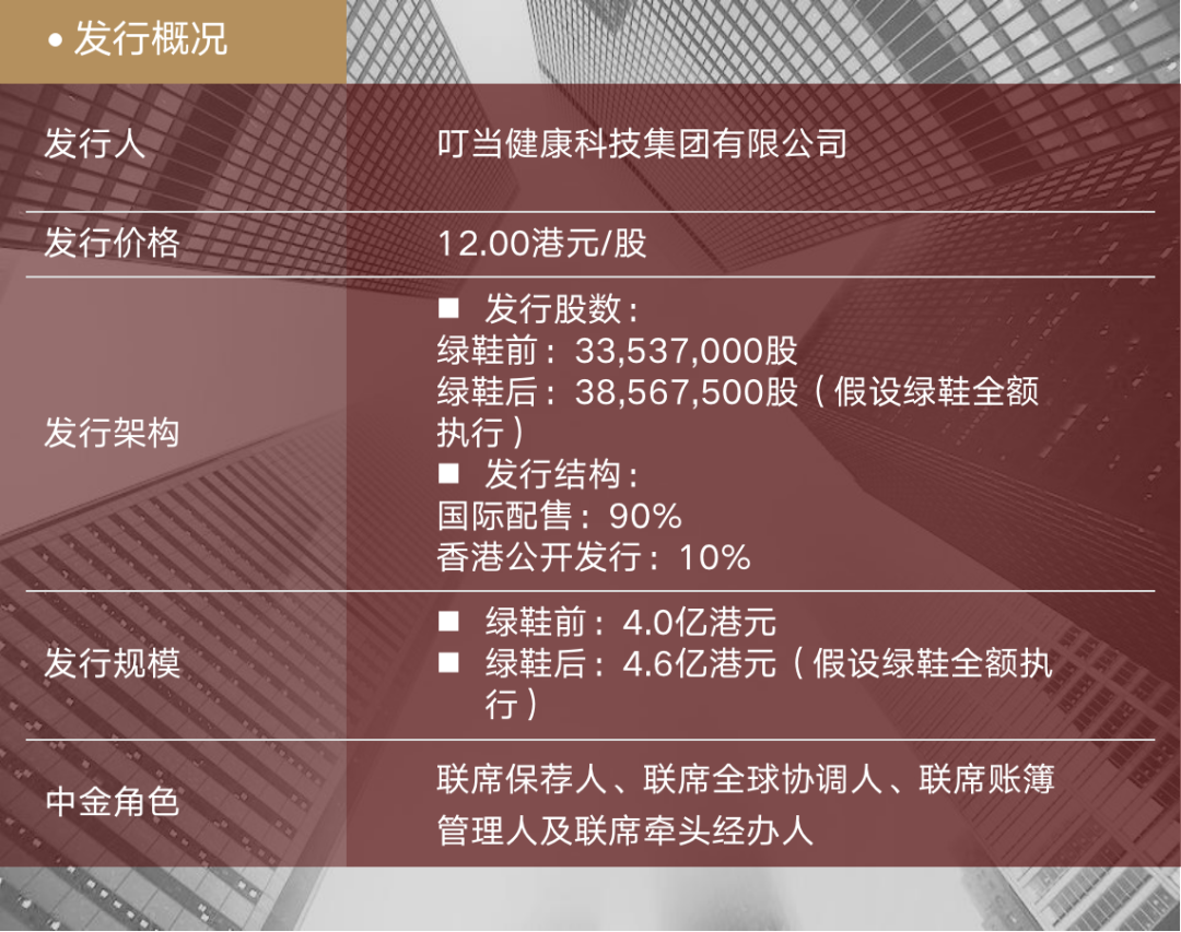 中金公司作为本次发行的联席保荐人,牵头项目执行工作。凭借丰富的资本市场服务经验,中金协助叮当健康积极与监管机构进行高效沟通,把控了项目质量和进度;并协助客户充分挖掘投资亮点,向市场上主流投资者及战略投资机构进行了充分推介,最终锁定重要投资者,为公司顺利上市保驾护航。