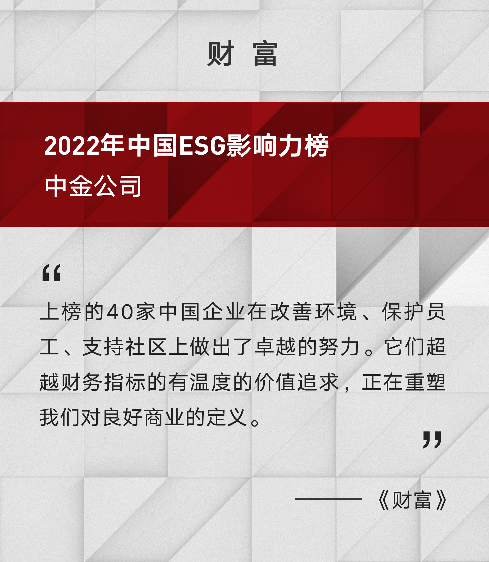 8月23日,《财富》(Fortune)正式公布了其“2022年中国ESG影响力榜”全部获奖结果。中金公司凭借在ESG领域持续践行的优异成绩荣膺入选本届榜单。