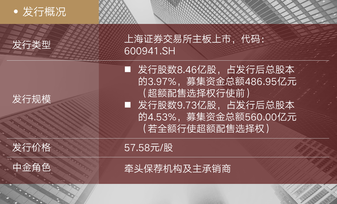 1月5日,中国移动有限公司(简称“中国移动”或“公司”,A股代码:600941.SH,港股代码:0941.HK)于上海证券交易所主板上市,中金公司担任牵头保荐机构及主承销商。