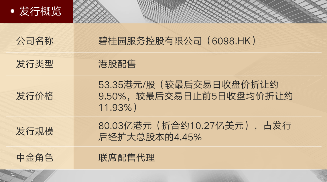 2021年11月18日,碧桂园服务控股有限公司(“碧桂园服务”,或“公司”,6098.HK)完成港股配售的定价。此次再融资预计募集资金总额约80.03亿港元,折合约10.27亿美元。中金公司担任本次项目的联席配售代理。