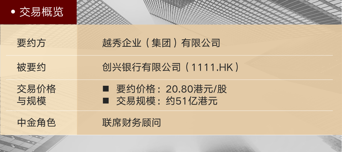 2021年9月30日,越秀企业(集团)有限公司(“越秀集团”)完成以协议安排私有化创兴银行有限公司(“创兴银行”或“公司”,1111.HK)的交易。本次交易中,中金公司担任联席财务顾问。