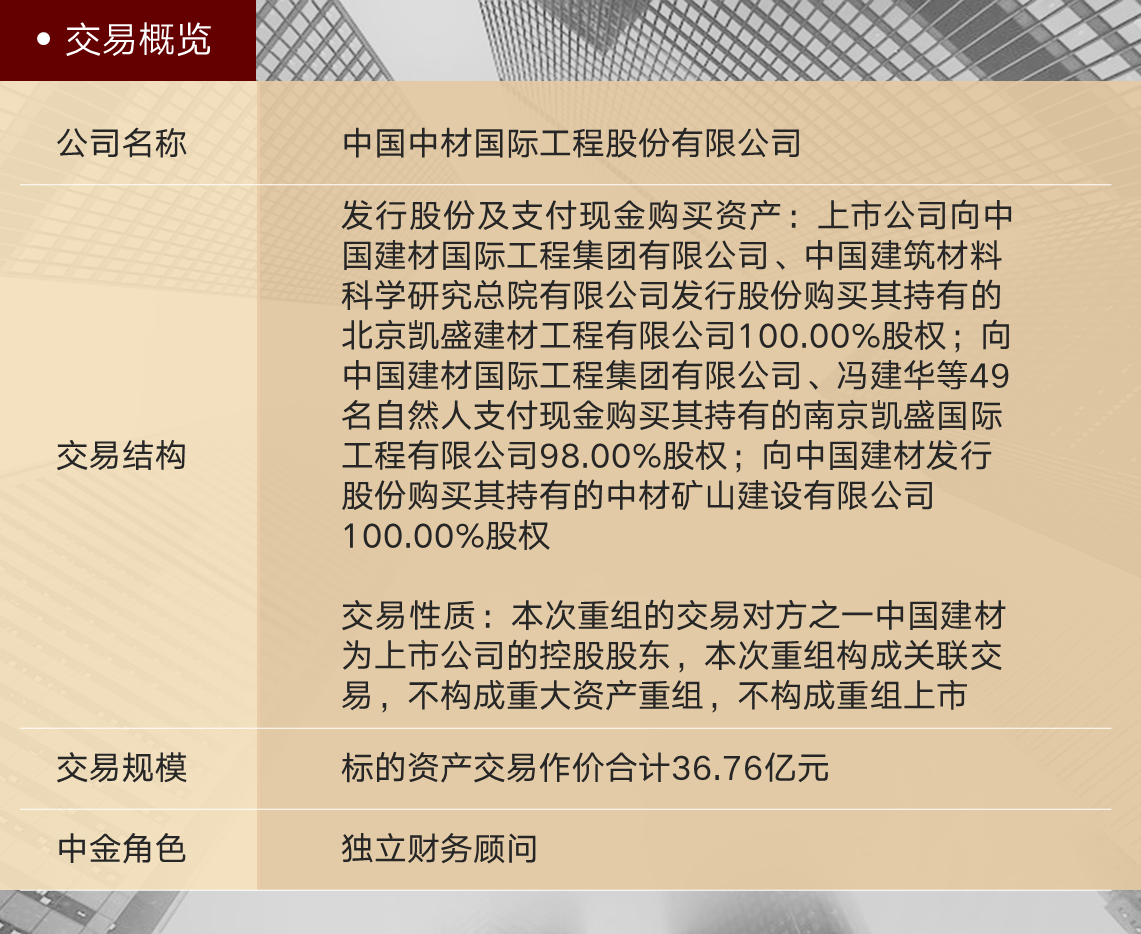 近日,中国中材国际工程股份有限公司(简称“中材国际” 或“上市公司”,600970.SH)发行股份及支付现金购买资产暨关联交易相关标的资产已完成交割,中金公司在本次交易中的担任上市公司独立财务顾问。