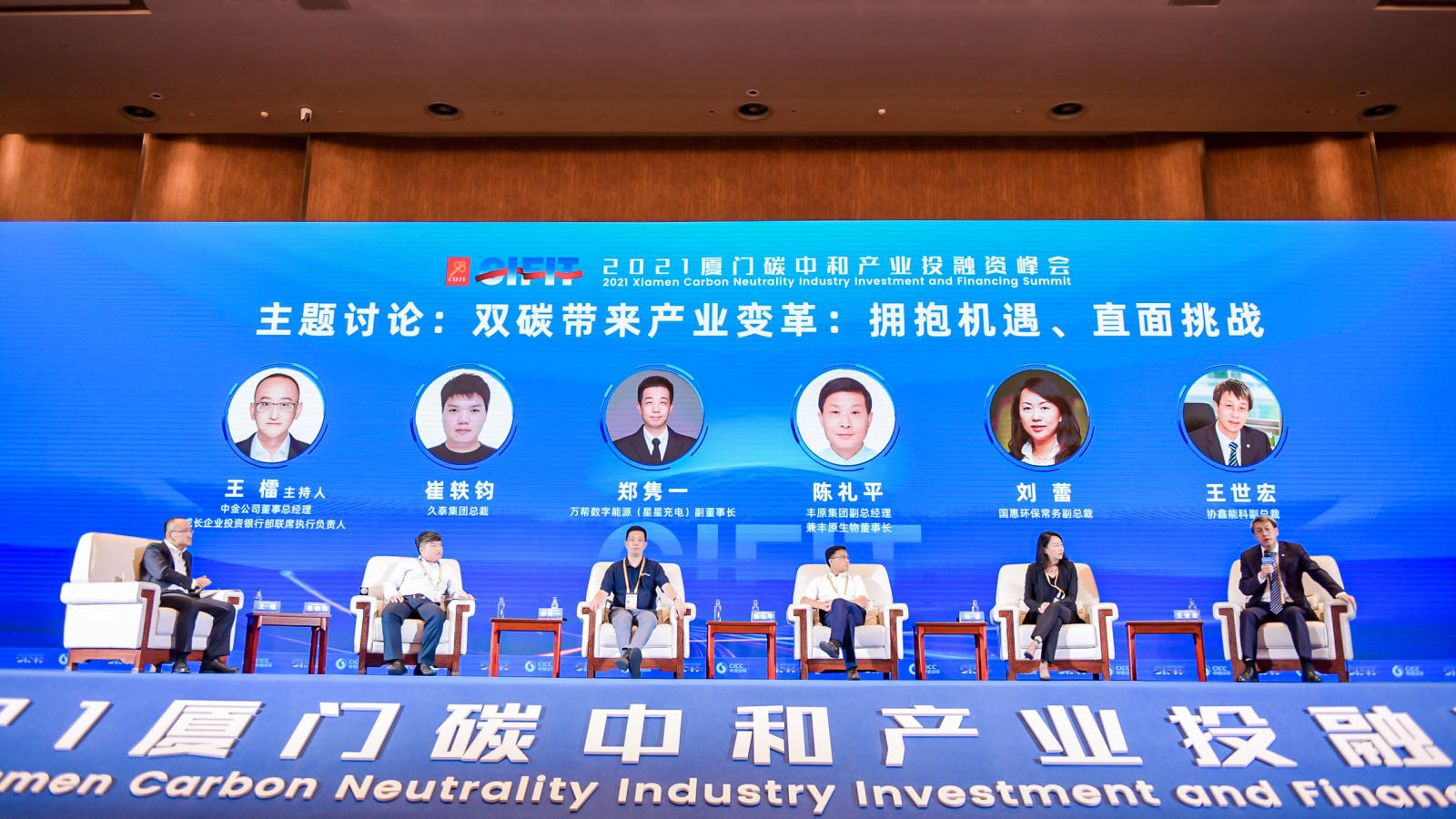 在中金公司董事总经理、成长企业投资银行部联席执行负责人王檑的主持下,久泰集团总裁崔轶钧,万帮数字能源(星星充电)副董事长郑隽一,丰原集团副总经理兼丰原生物董事长陈礼平,国惠环保常务副总裁刘蕾,协鑫能科副总裁王世宏共同进行了“双碳带来产业变革:拥抱机遇、直面挑战”主题讨论。来自行业一线的嘉宾们介绍了公司落实双碳战略的具体实践,畅想了企业所处细分领域在未来3-5年会对社会生活产生的影响,以及未来努力实现重点突破的层面。