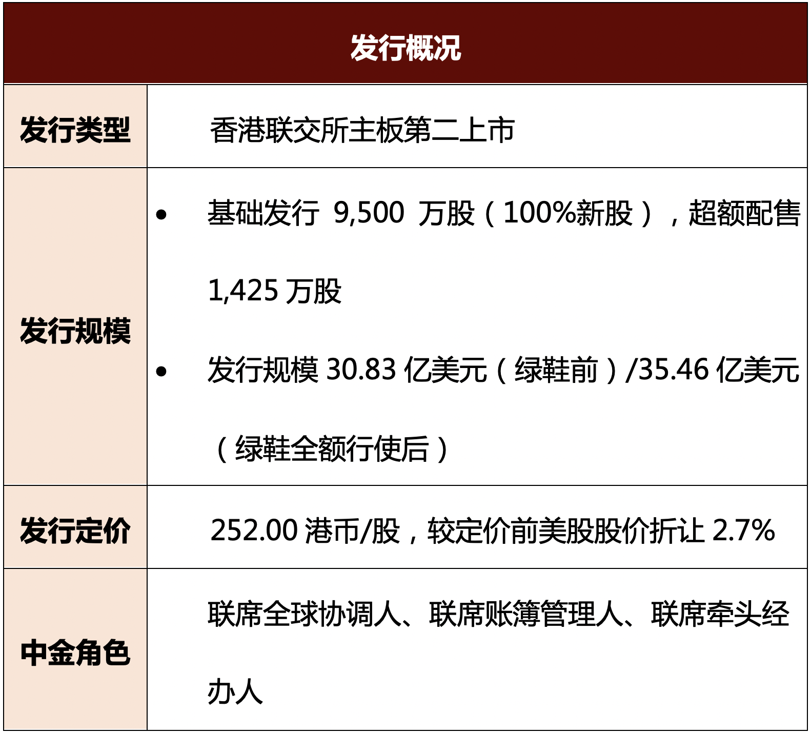 启动发行至定价期间中金公司在波动的市场环境下积极帮助公司进行投资者沟通,给予市场必要的信心,助力项目圆满完成。公司簿记期间股价涨幅约4.6%,在香港二次上市交易中表现优异。