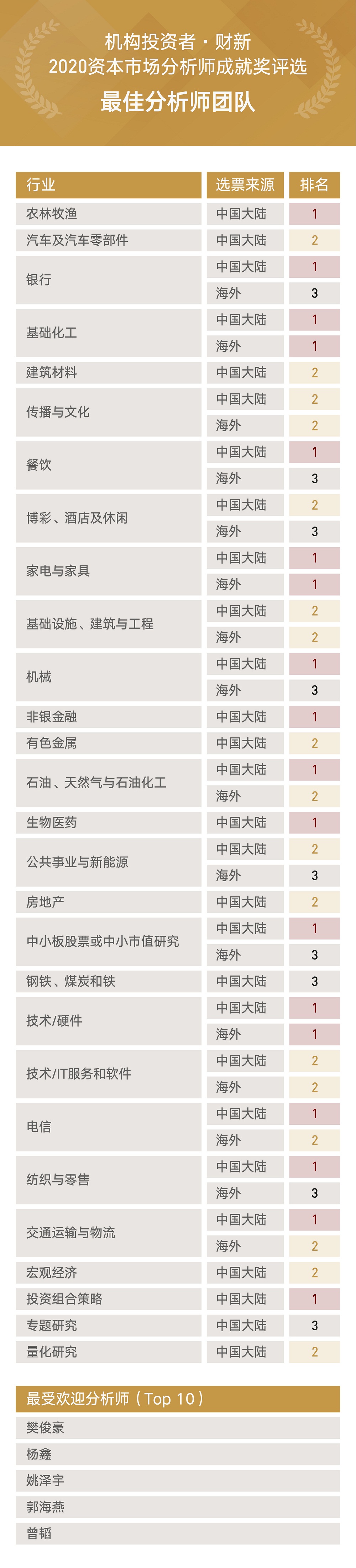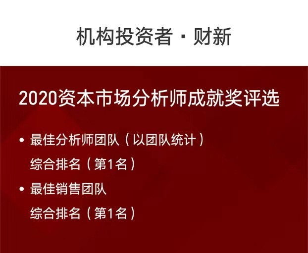 日前,机构投资者(Institutional Investor)和财新正式发布了2020资本市场分析师成就奖(All-China Research Team)评选全部获奖结果。中金凭借突出的专业实力,再次以优异成绩从激烈的评选中脱颖而出,同时摘取了“最佳分析师团队”(Firm Leaders)综合排名桂冠和“最佳销售团队”综合排名榜首。