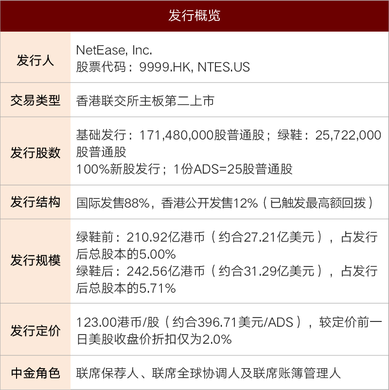 由于公司已在美股上市,市场、媒体关注度极高,自阿里巴巴去年香港上市后,也有诸多对于网易的猜测。项目自正式启动后,执行严格保密,成功最小化市场风险;中金公司全程牵头,积极配合公司高效高质量地在短时间内完成各项执行工作,并以极高效率完成本次发行,克服新冠疫情带来的旅行限制等困难,为项目保驾护航。