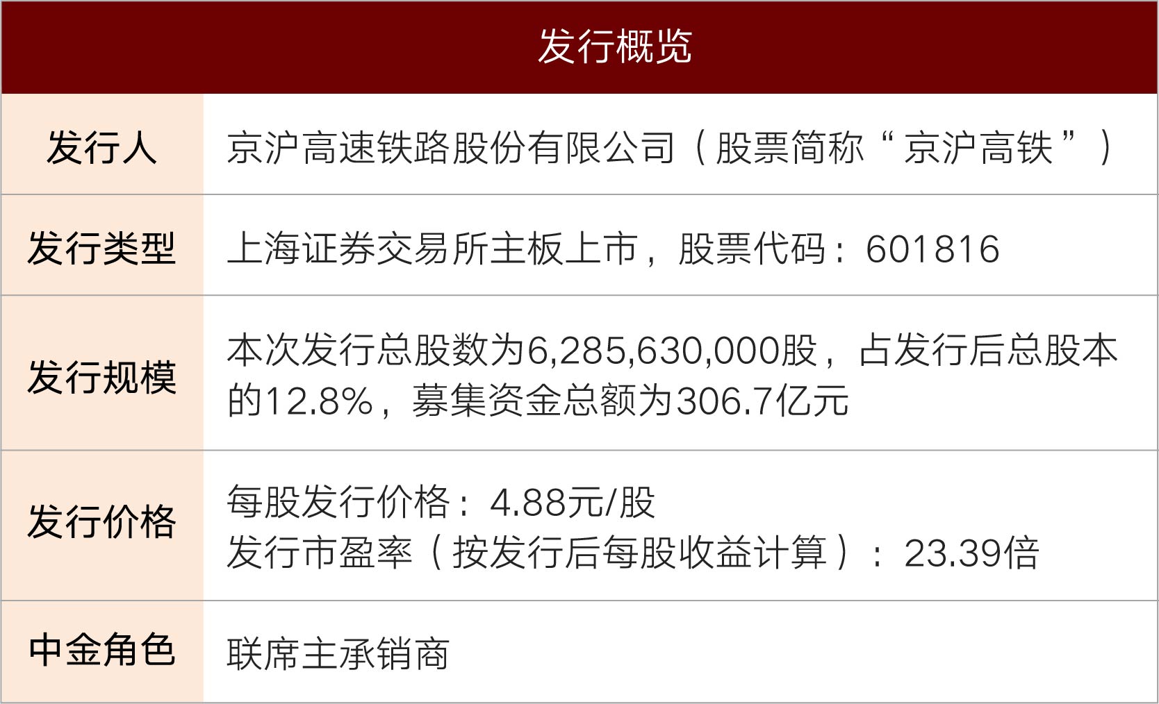 本次公开发行新股628,563.00万股,占发行后公司总股本的12.8%,发行价格4.88元/股,募集资金总额约306.7亿元。中国国际金融股份有限公司(以下简称“中金公司”)在本项目中担任联席主承销商。
